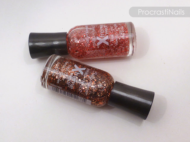 When I'm feeling down I usually stop by the pharmacy on my way home and pick up a bottle or two of cheap nail polish. The last time this happened I picked up two of the glitters from the Sally Hansen Limited Edition Fall 2013 Xtreme Wear Collection: Frazzle Dazzle (the copper glitter) and Rosey Shooter (the red and white glitter with the stupid name). I thought they'd both be cute for simple Christmas manis, and I was right!