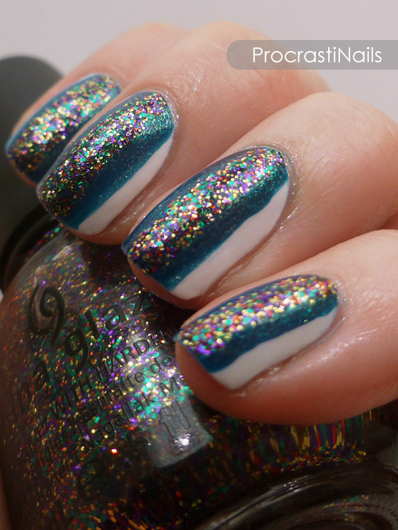 This is one of those designs that was awesome in my mind, and not-so-awesome when I actually did it. Today's challenge for the 12 Days of Christmas Nail Art was to use festive colours and glitter, and I decided to go outside of the boring red and green glitter and use China Glaze's Glitter All The Way from last year's holiday collection as my centrepiece. Unfortunately the whole thing just didn't mesh as well as I had hoped. It's not terrible, I suppose...