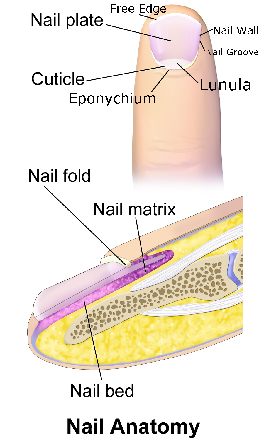 The one part I did find the useful though was the info on the nail and cuticle specifically. (Look at the image I edited to the right to help myself study!) Knowing what dictates how thick your nail will be (the nail matrix — not nail thickening products) and where your cuticle actually ends and your eponychium (don’t cut it, it’s keeping you safe from infection!) begins is important so that you can explain it to clients, especially ones who like to go all-out when it comes to nipping their cuticles.