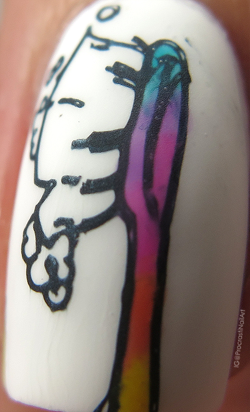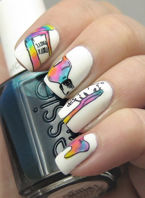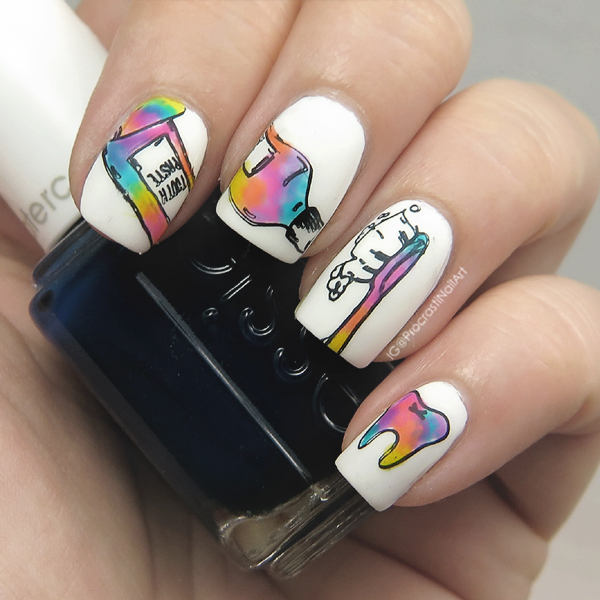 It started out with a base of Sinful Colors Snow Me White followed by stamping with Qgirl-040. When it was dry I did a fun rainbow gradient using the Essie Silk Watercolor Collection and sealed with matte top coat because everything is better matte. 🙂