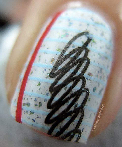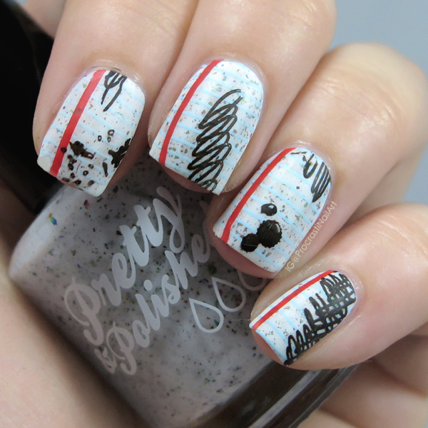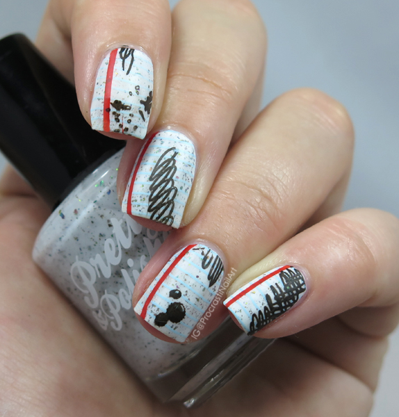 As you can see, I recreated an image of lined paper with doodles and scribbles all over it on my nails! To make it a little more interesting I used a white base with some flakies in it (Pretty & Polished Maleficium) and then stamped the lines for my paper before stamping on some scribbles.
