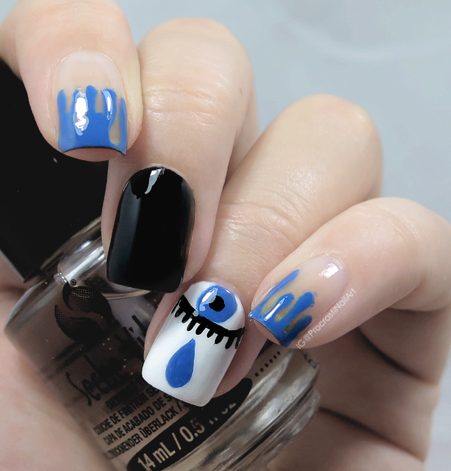 I have been wanting to do a mani with the cuticle eyeballs for ages but never got around to it. But I knew it would be PERFECT to help represent tragedy for this mani! Once my base coat (Ceramic Glaze Pure, naturally) was applied to my ring finger I used a detailing brush and my polishes (Ceramic Glaze Little Black Dress and CND Vinylux Date Night).