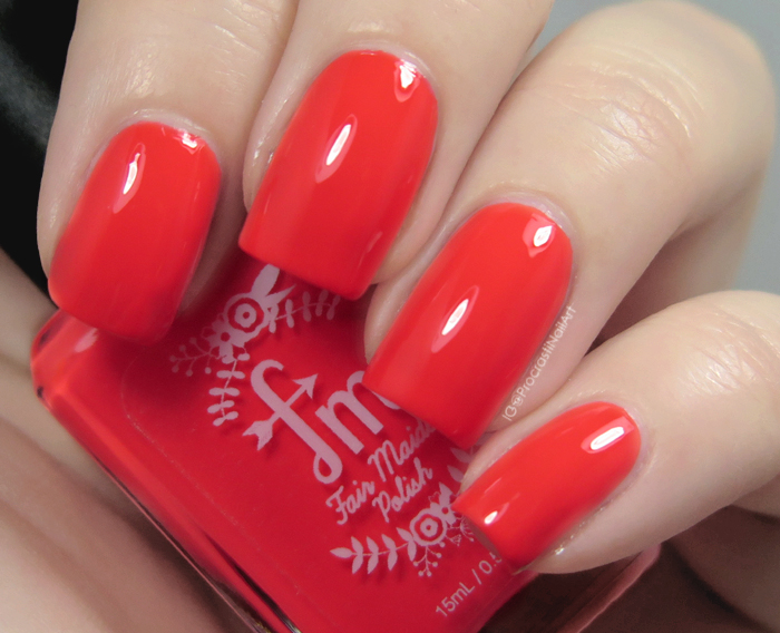 Fair Maiden Polish Daredevil is part of The Rainbow Brights Collection. It's a bright neon red creme that leans ever-so-slightly orange, and it is impossible to properly capture this beauty with my camera. It's a tiny hint more coral in real life! This is three coats with top coat, but if you do thicker coats than me you can get away with two coats. :)
