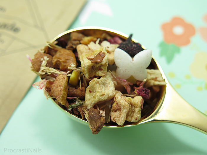 First up is the tea I am most looking forward to trying. This smells SOOOO good! Sweet and tart and exactly like raspberry lemonade. I'm not usually a fan of warm tea with raspberry in it, but I think brewing this over ice will help with that. It will be a yummy treat to carry on my way to class in the morning! And how CUTE are those little sugar butterflies?!
