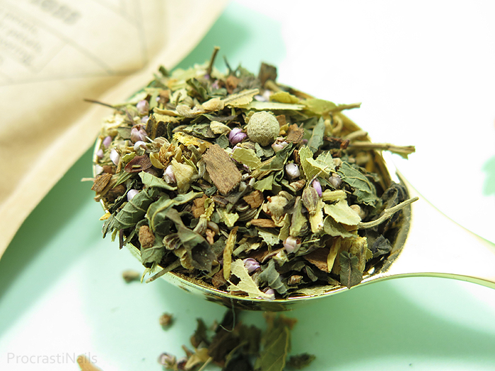 This one smells more like a tea that is good for you than a tea that is yummy. I'm okay with that, though. Apparently this blend is supposed to help "decrease and eliminate symptoms of heartburn, indigestion, other gastro intestinal distresses, provide relief for constipation, relieve nausea, boost the immune system, act as an antiseptic and an anti inflammatory aid." That's a big list of uses! I'll definitely pull this on out next time I have a tummy ache or feel sick, and I'll let you know what I think.