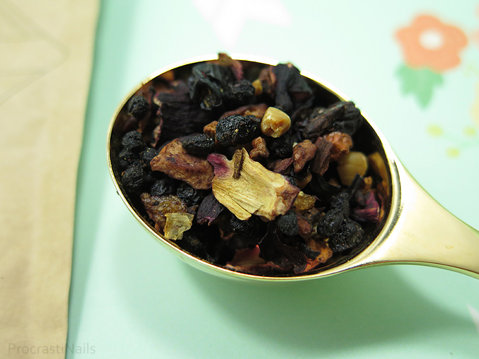 Fruit Tea - Hibiscus, apple pieces, grapes, elderberries, figs, dates, almond pieces, cinnamon, citrus peel, flavoring, lemon granulate.