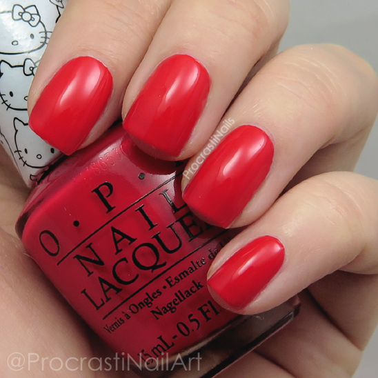 OPI 5 Apples Tall is a bright apple red creme that leans slightly pink, and it's one of my favourite shades from the OPI Hello Kitty Collection. :) I've used this polish once as a base for nail art for my Ralph the Rabbit nails.